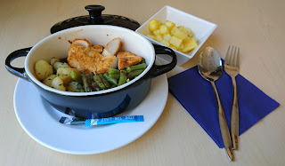 17:30 uur: Vanavond lekker gegeten: kip met aardappelen en spercieboontjes en een heerlijke jus. Vanuit de pan op het bord vind ik toch wat prettiger eten. En een bakje ananas erbij. Het leven is hier zo slecht nog niet. ;-)