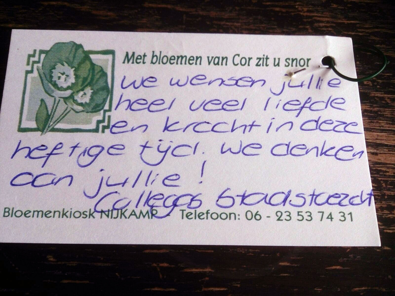 Later in de middag appt mijn vrouw wat foto's van een mooi boeket bloemen dat ze van mijn collega's van Handhaving/Stadstoezicht had ontvangen. Op mijn kamer mag ik vanwege infectiegevaar geen bloemen ontvangen, dus dit was een mooi alternatief. Bovendien ook heel fijn voor mijn vrouw die - misschien nog wel meer dan ik - meer op haar 'dak' krijgt dan ik. Voor haar wel verdiend!!! Even later stuurt ze me een berichtje: "Fijn hè dat zoveel mensen ons steunen. Het is hartverwarmend! Ik hou van je!" Ik krijg tranen in m'n ogen en luister naar de zingende vogels in de binnentuin. Ze heeft gelijk!
